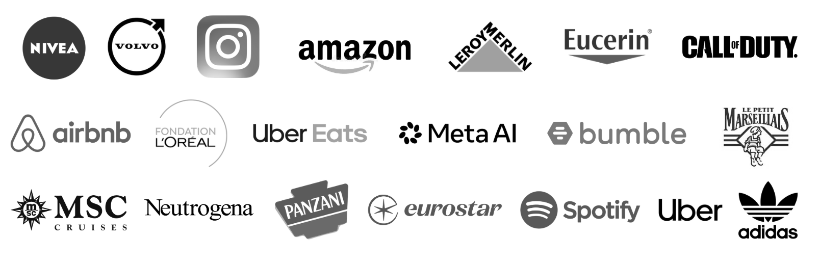 Depuis 2014, nous accompagnons des marques françaises et internationales dans leurs stratégies d'influence, de relations presse et de social media. Notre portefeuille couvre une grande diversité de secteurs : hygiène-beauté avec NIVEA, Eucerin, Neutrogena et Le Petit Marseillais, automobile avec Volvo, mode avec Adidas, tech et digital avec Instagram, Meta AI, Amazon, Bumble et Spotify, food et grande consommation avec Panzani et Uber Eats, tourisme et transport avec Airbnb, Eurostar, MSC Croisières et Uber, retail et habitat avec Leroy Merlin, gaming et entertainment avec Call of Duty, et engagement institutionnel avec la Fondation L'Oréal.